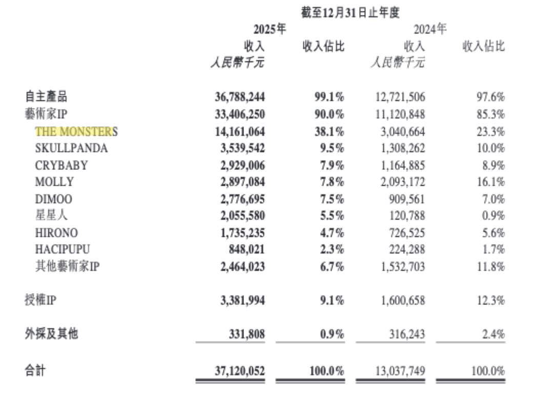 大开财报,你会发现一个细节:THE MONSTERS系列,也等于环球持重的Labubu,全年收入141.6亿,占了总营收的38%。如果算上毛绒品类里Labubu的孝敬,这个IP着实扛起了公司的半壁山河。