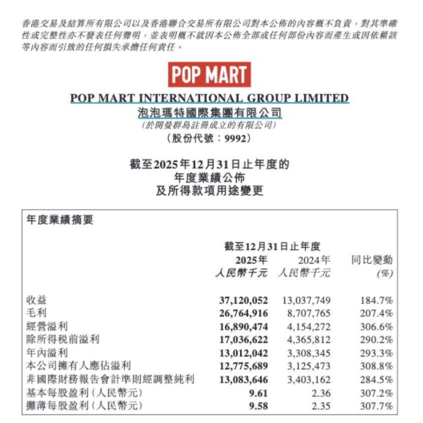 泡泡玛特,这家靠盲盒起家的潮玩巨头,3月25日发布2025年度财报:全年营收371亿,涨了184%;净利润127亿,涨了308%;更“惊艳”的是72.1%的毛利率,这意味着耗费者花100块钱买它家东西,它回身就揣进兜里72块。